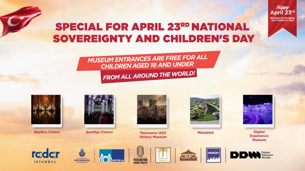 Affiliated with İstanbul Metropolitan Municipality Kültür AŞ. will host visitors under the age of 18 on April 23rd at Basilica Cistern, Şerefiye Cistern, Panorama 1453 History Museum, Miniaturk, and Digital Experience Museum. As part of the campaign valid for all children worldwide, visitors must show the QR code obtained via the Radar Istanbul app and their identification card upon museum entry.